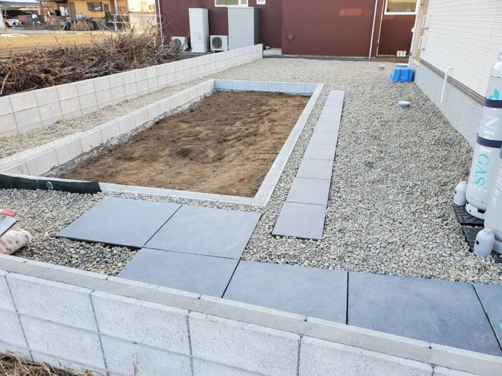 砂利も入れつつ、ちょっとした花壇を造作し、砂利は少し歩き辛くなってしまうので、そこまでの動線で歩きやすいよう、新築で余ったタイルを施工しています。